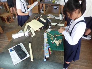 図工室から金づちやのこぎりの音が聞こえてきました。4年生が「トントンつないで」というテーマで,木工の工作に取り組んでいました。